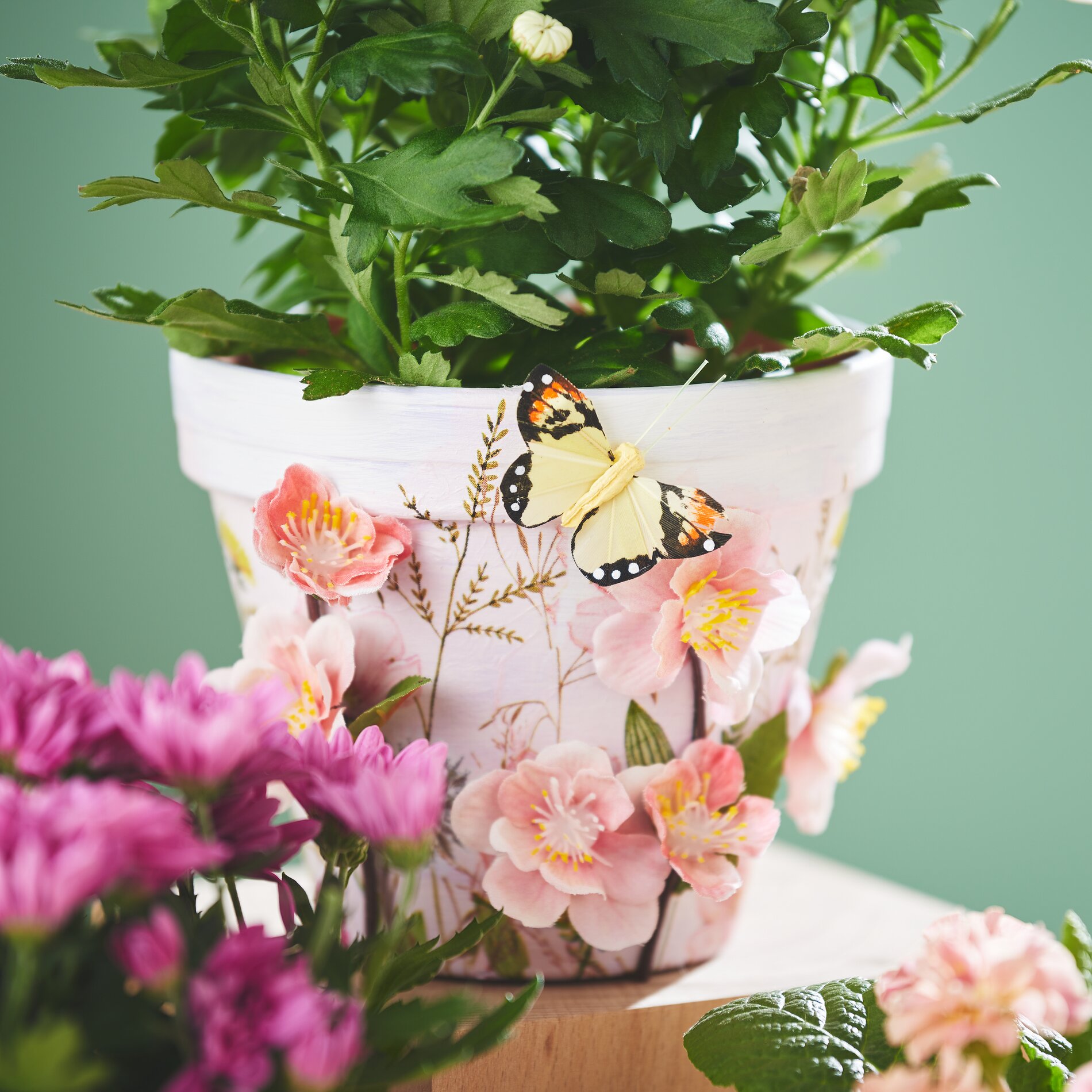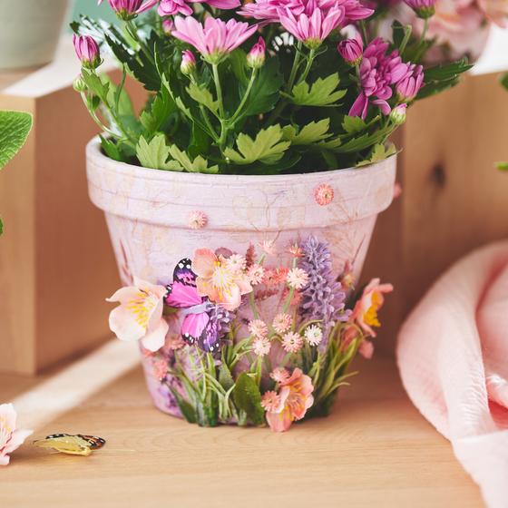 Ulteriori suggerimenti per il design- Accorci i fiori artificiali o prenda dei fiori singoli e li incolli al vaso con la colla a caldo.