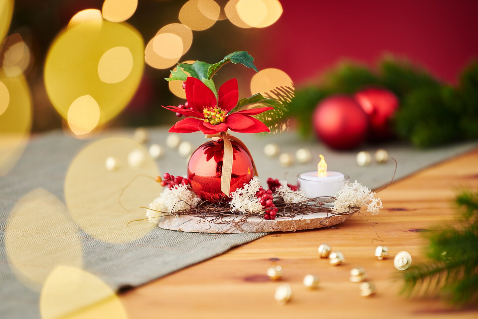 Accorciare e sistemare i fiori Ora prendete alcuni fiori dalla vostra composizione natalizia e accorciate gli steli con delle tronchesine. In questo modo, i fiori si inseriranno perfettamente nell'apertura del gingillo natalizio. Inserite con cura i fiori accorciati nel gingillo fino a quando non sarete soddisfatti della composizione.