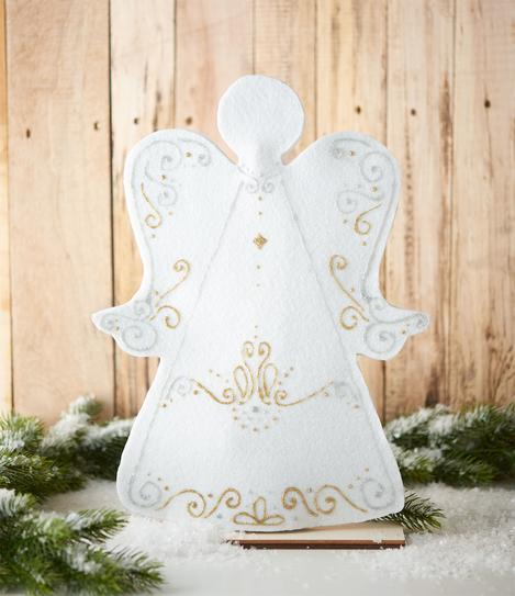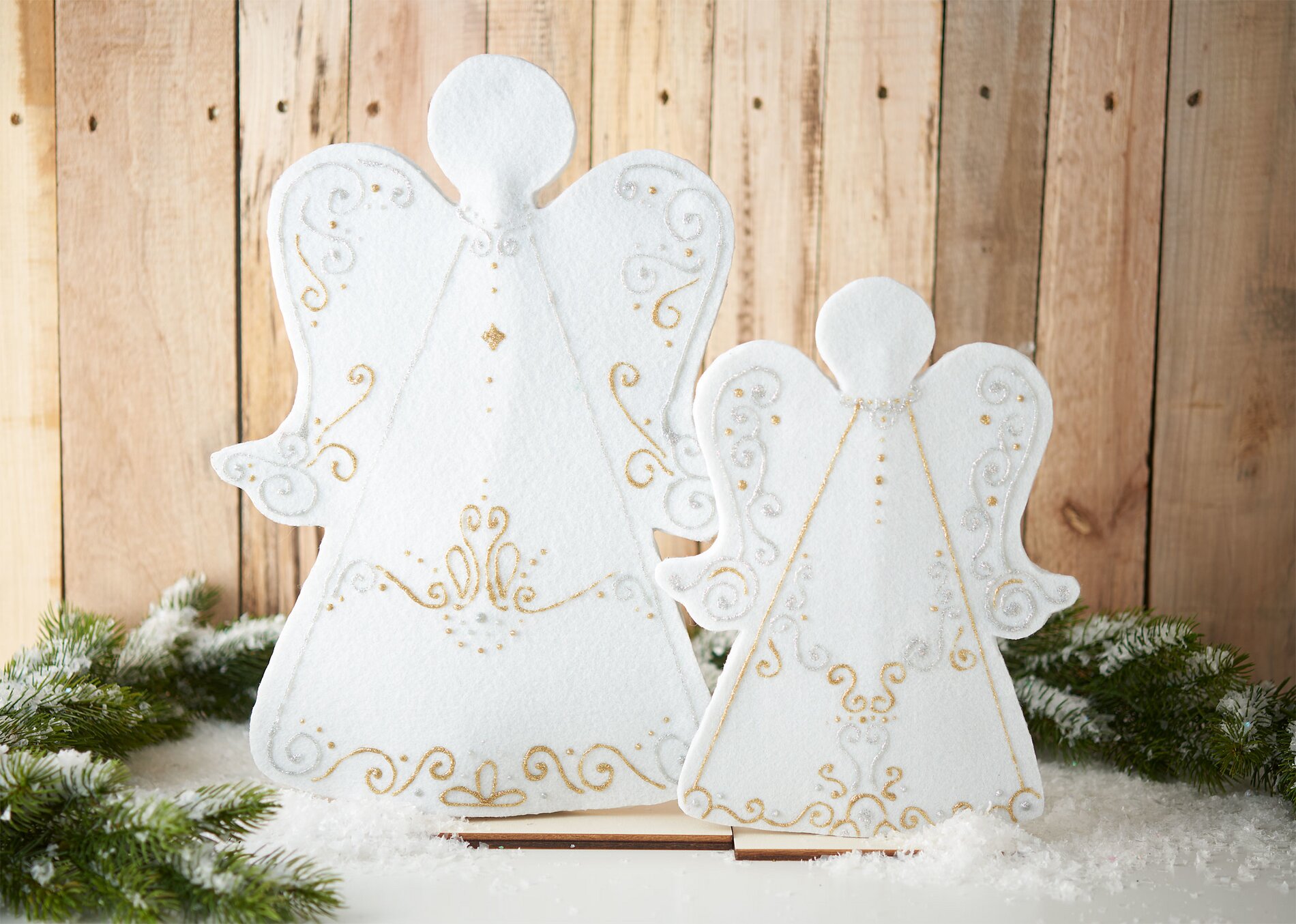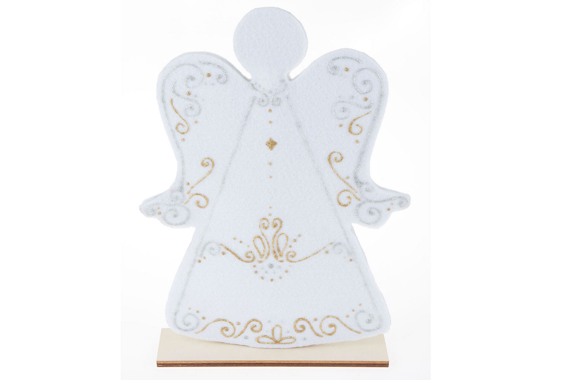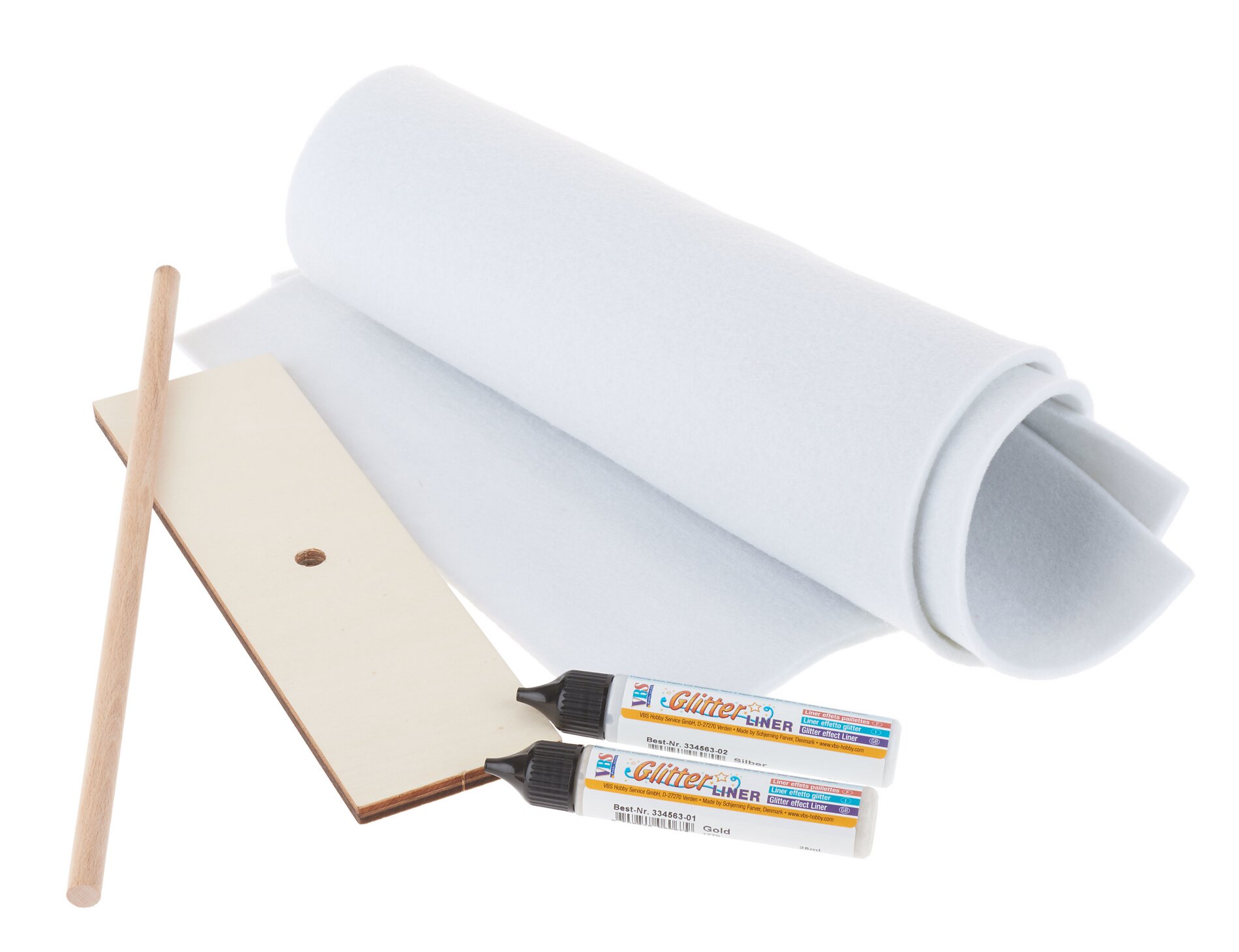Copiare il modello del motivo e trasferire la figura due volte sul pezzo di feltro bianco. Ritagliare entrambe le sagome di angelo e decorarle con le fodere glitterate con contorni dorati e argentati.