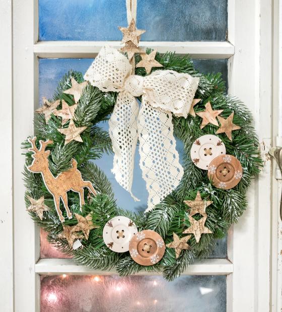 Incollate le stelle di sughero e il cervo o altri accessori decorativi alla ghirlanda con la colla a caldo, secondo il vostro gusto personale.