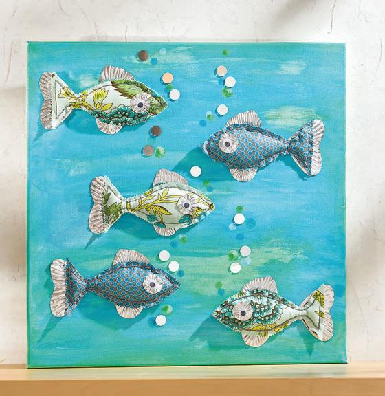Materiali diversi sono combinati in modo insolito su questa cornice decorativa. I pesci in tessuto colorato sono dotati di pinne in lamiera di alluminio scintillante. Tutti gli elementi sono poi disposti in modo da creare un effetto 3D, molto chic!