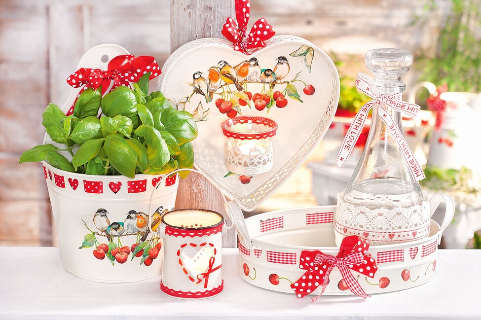 Seguire una tendenza cromatica è una di quelle cose: se i colori non sono esattamente adatti all'uso quotidiano, la decorazione non è evergreen. Ma con il rosso e il crema non si sbaglia mai. Qui vi mostriamo come potete decorare alcuni oggetti decorativi in modo bello e amorevole utilizzando la tecnica del tovagliolo e qualche fiocco.
