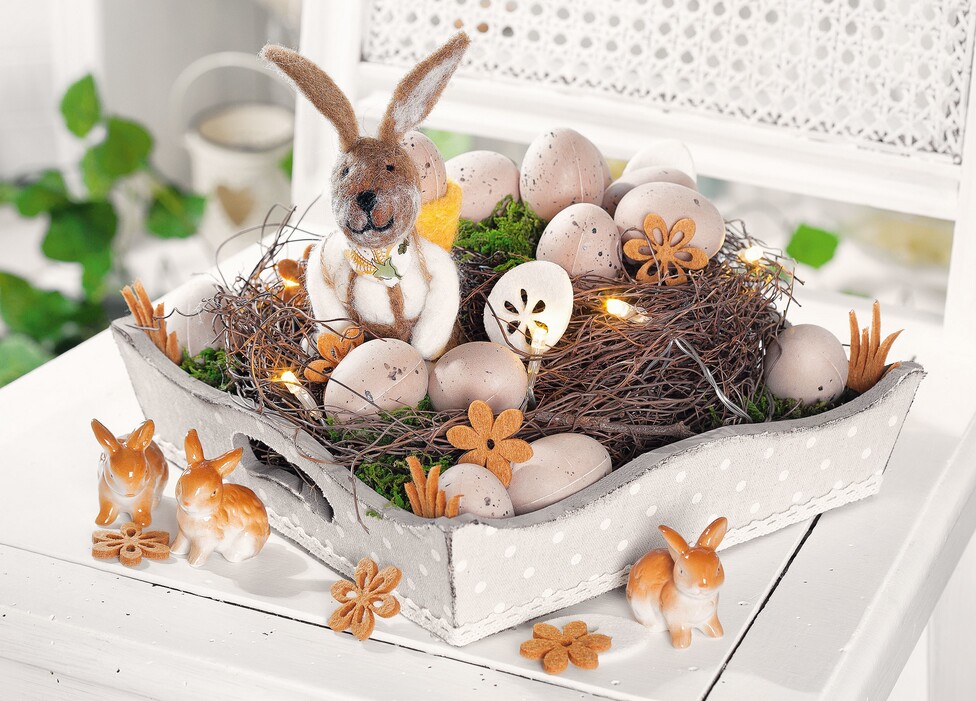 Posizionare alcuni coniglietti decorativi o altre figure davanti al vassoio.