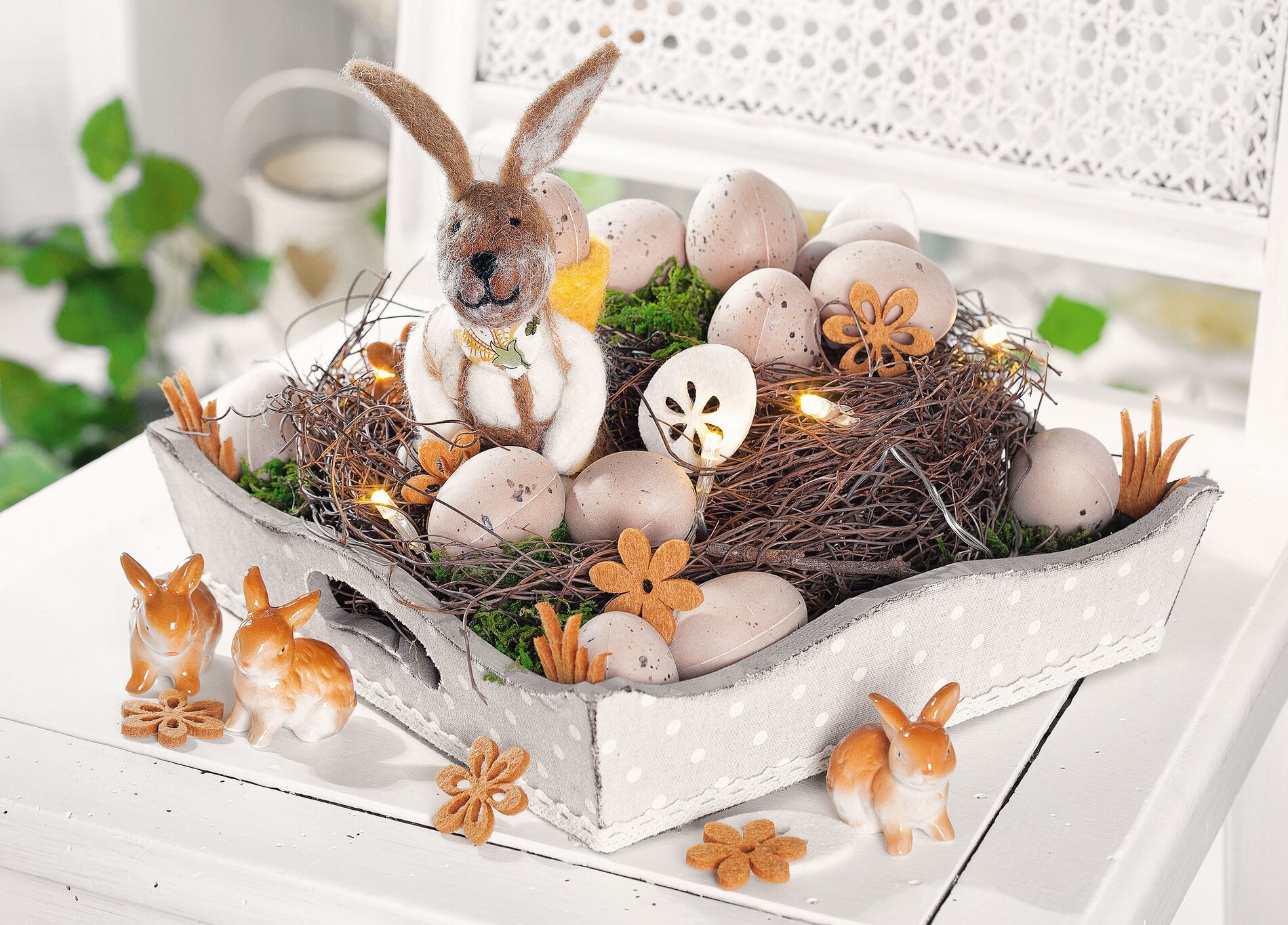 Una composizione pasquale un po' diversa: questo nido pasquale con coniglietto, uova di Pasqua e piccoli fiori di feltro è realizzato in un vassoio. Decorata con amore con stoffa e pizzo, la decorazione ha un aspetto romantico e pasquale allo stesso tempo.