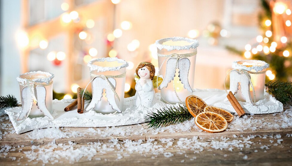 Una volta che tutto è asciutto, è il momento di decorare: Basta posizionare i vasetti di tea light nelle apposite cavità e attaccare a ciascun vasetto un nastro con un'ala d'angelo. Poi basterà disporre gli angeli e gli accessori natalizi sul portacandele.