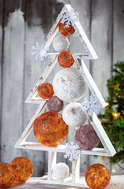 Per facilitare la disposizione dei baubles sull'albero, stendetelo in piano sul tavolo. Sistemate i baubles e fissateli con un punto di colla a caldo, così come i fiocchi di neve, che sono attaccati all'esterno dell'albero. Se si posiziona l'albero in modo che si possa vedere il fronte e il retro, i fiocchi di neve devono essere attaccati su entrambi i lati.