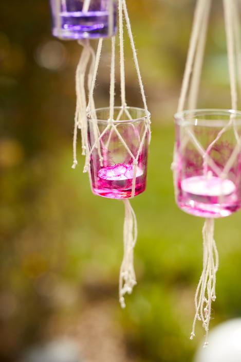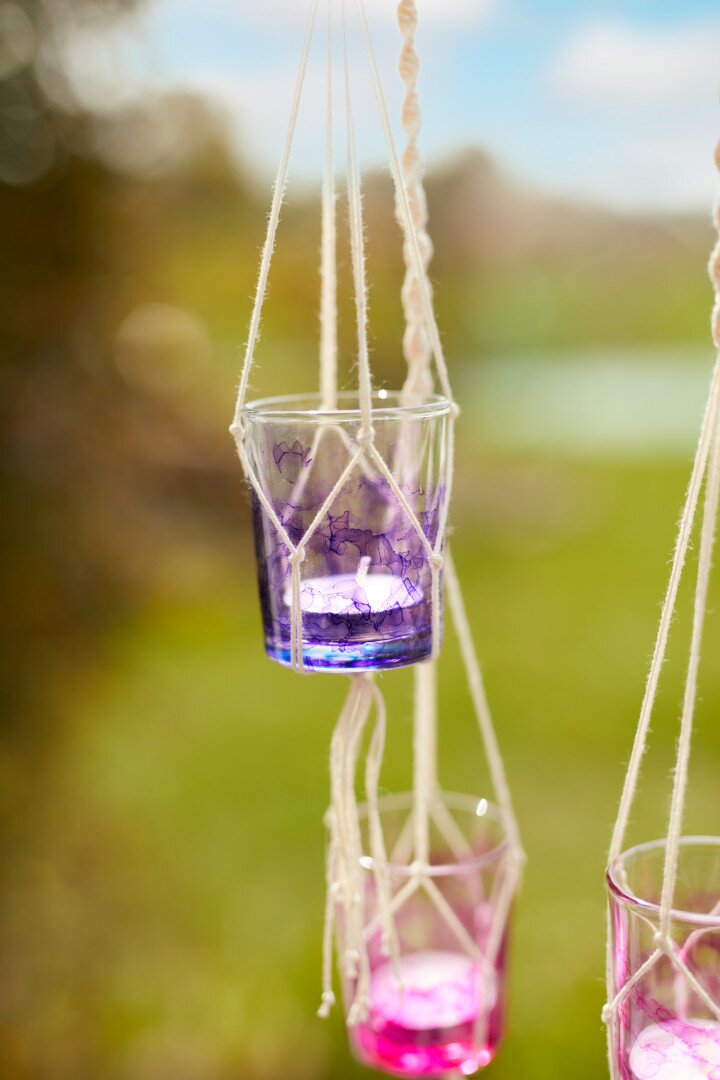 Infine, rimuovete le strisce adesive che avete usato per fissare il bicchiere della tealight all'inizio. Legate allo stesso modo le altre sospensioni per tealight.