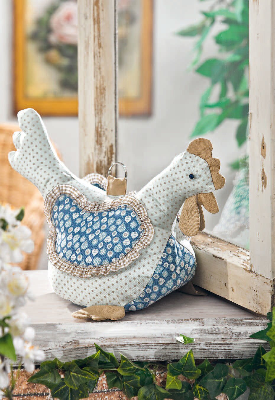 Ritagliare la cresta, il becco, i bargigli e le zampe dall'imbottitura con un margine di cucitura di 0,5 cm, posizionarli sulle due stoffe grezze e cucirli insieme, tranne che per un'apertura di risvolto, quindi rivoltare e stirare. Imbastire a mano il nastro con i volant intorno alle ali , ricoprirle con il vello di volume e cucirle al corpo. Cucire il ventre tra le due metà, dritto contro dritto, attaccando anche i piedi .
