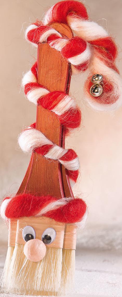 Per il "cappello", tirare prima la lana da favola bianca e rossa in un lungo filo (60 cm di lunghezza, se volete), attorcigliarlo e poi avvolgere il cordoncino di feltro autocostruito intorno al gambo, fissandolo in posizione.