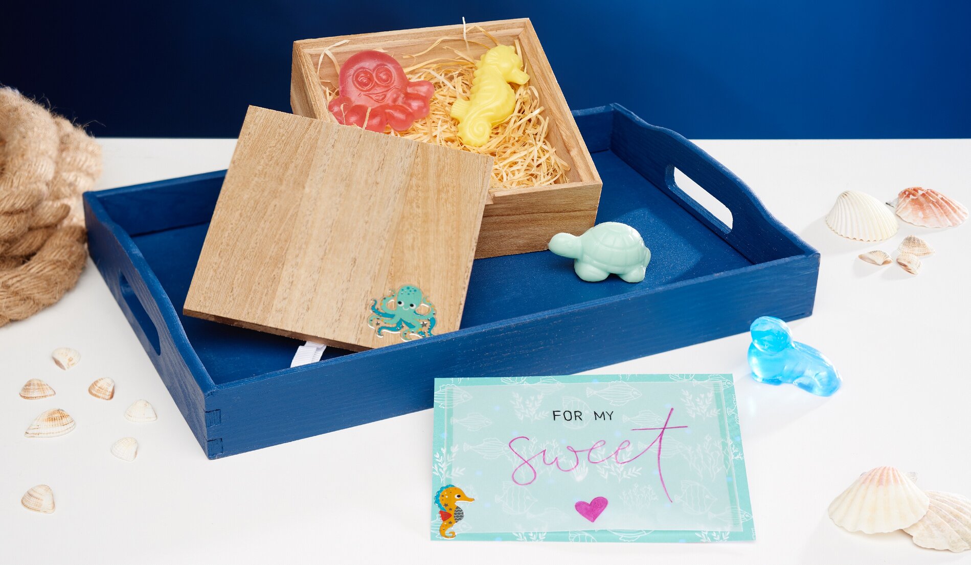 Queste simpatiche creature marine sono realizzate in sapone. Confezionate in una scatola di legno decorata, sono un regalo meraviglioso.