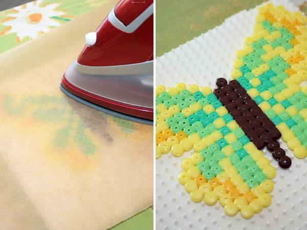 Sind die Motive fertig, legt ihr ein ausreichend großes Stück Backpapier über die gesamte Platte. Mit dem heißem Bügeleisen geht ihr dann solange über die Perlen, bis diese ausreichend geschmolzen sind. Soll das Mobile später draußen im Wind hängen, dann lieber etwas mehr, als zu wenig bügeln.