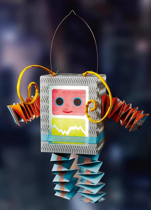 Die Bastelidee für den Roboter stammt aus dem Buch „Meine Laternenwerkstatt“. Hinter der Idee steckt jedoch ein Laternenrohling aus Wellpappe. Somit steht schon die stabile Umrandung für die Laterne. Die „Gläser“ bestehen meist aus Transparentpapier und alles andere ist der Phantasie überlassen.