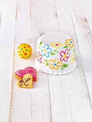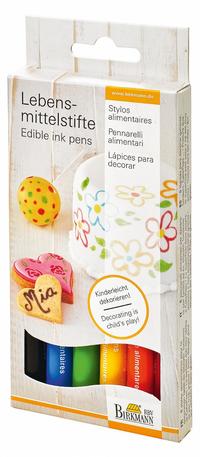 Für filigranere Dekorationen sind Lebensmittelstifte zu empfehlen. Hiermit gelingen besonders Texte, Zeichnungen und Ornamente gut. Im Set sind sechs Farben enthalten: schwarz, blau, grün, gelb, orange und rot.