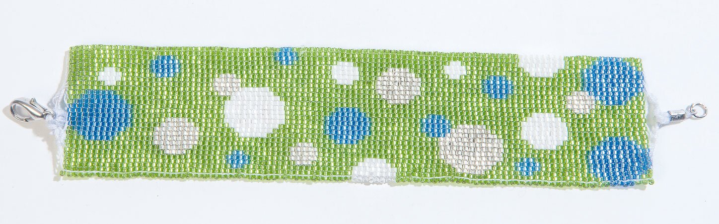 Quindi infilare le perline da destra sopra i fili dell'ordito con l'ago per infilare le perline. Intrecciare l'intero braccialetto in questo modo, secondo lo schema. Una volta raggiunta la marcatura, annodare il filo di tessitura al bordo esterno destro dei fili di ordito.