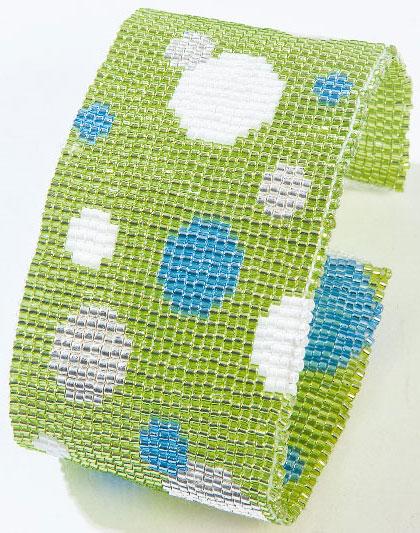 Misurare quindi la circonferenza del polso con un metro e fare un segno corrispondente sui fili dell'ordito. Infilare ora 29 perline per ogni fila secondo lo schema e premerle verso l'alto sotto i fili dell'ordito con l'indice della mano sinistra, in modo che le perline si trovino tra i fili dell'ordito.