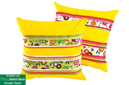 Strisce di tessuti diversi, nastri e pizzi colorati vengono applicati ai cuscini colorati.