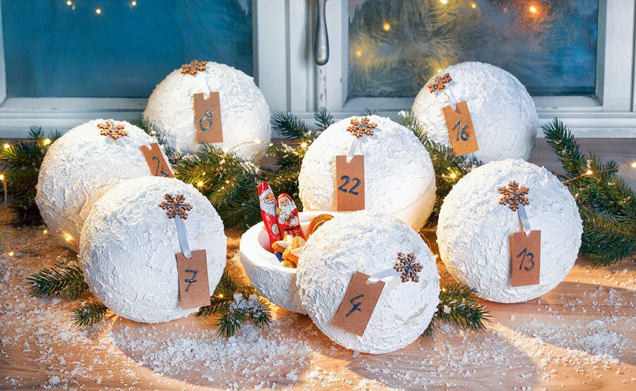 Tamponare generosamente la neve decorativa sulle metà delle palline di polistirolo con un pennello a setole e lasciare asciugare bene il tutto.