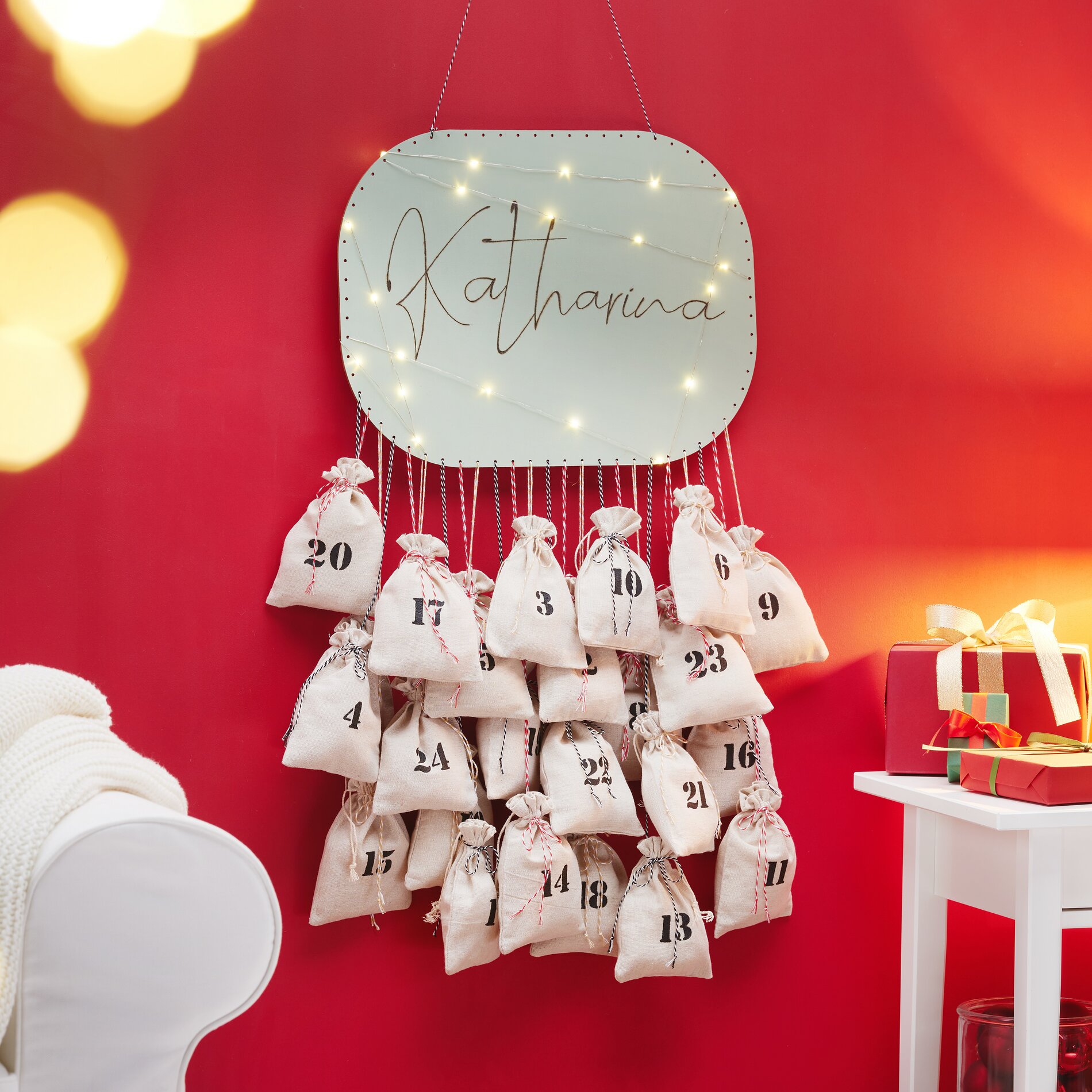 Una volta che il colore si è asciugato, si possono riempire i sacchetti con il contenuto desiderato. Chiudete quindi i nastri già attaccati ai sacchetti legandoli sul retro. Per il tocco finale, fate un elegante fiocco con i cordoncini e infilate un altro cordoncino in modo che i sacchetti possano essere appesi facilmente.