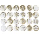 I bottoni del calendario dell'Avvento PERLMUTT hanno un aspetto molto elegante grazie alla combinazione di colori bianco e madreperla. I bottoni con i numeri da 1 a 24 hanno un diametro di circa 2,4 cm. Con spille.