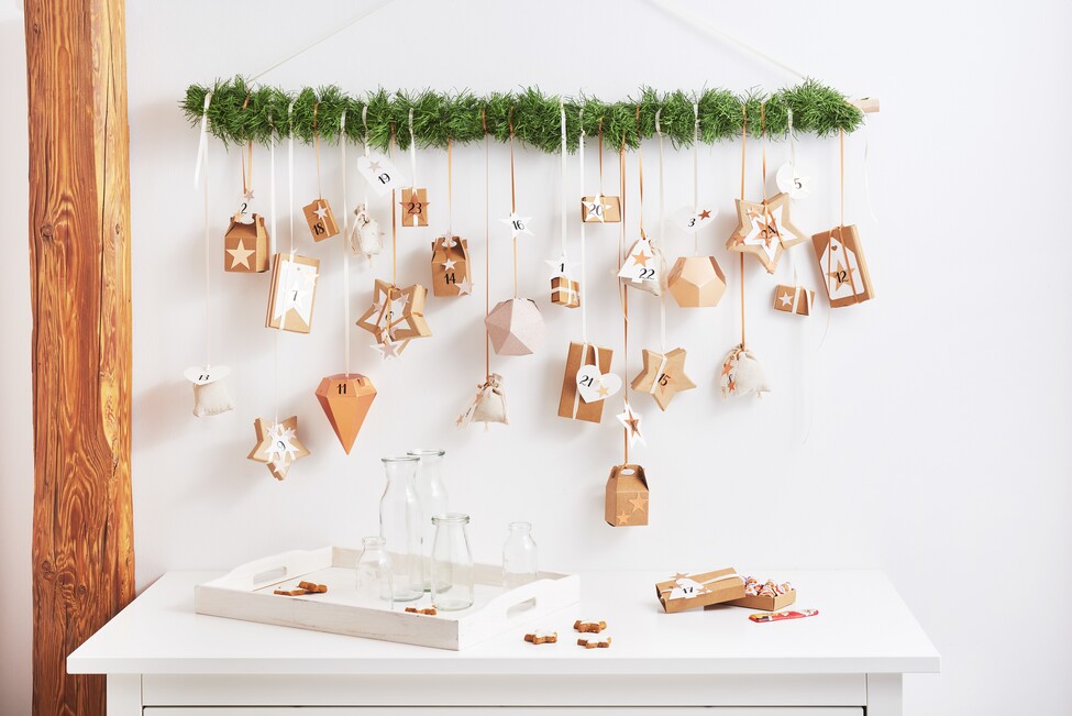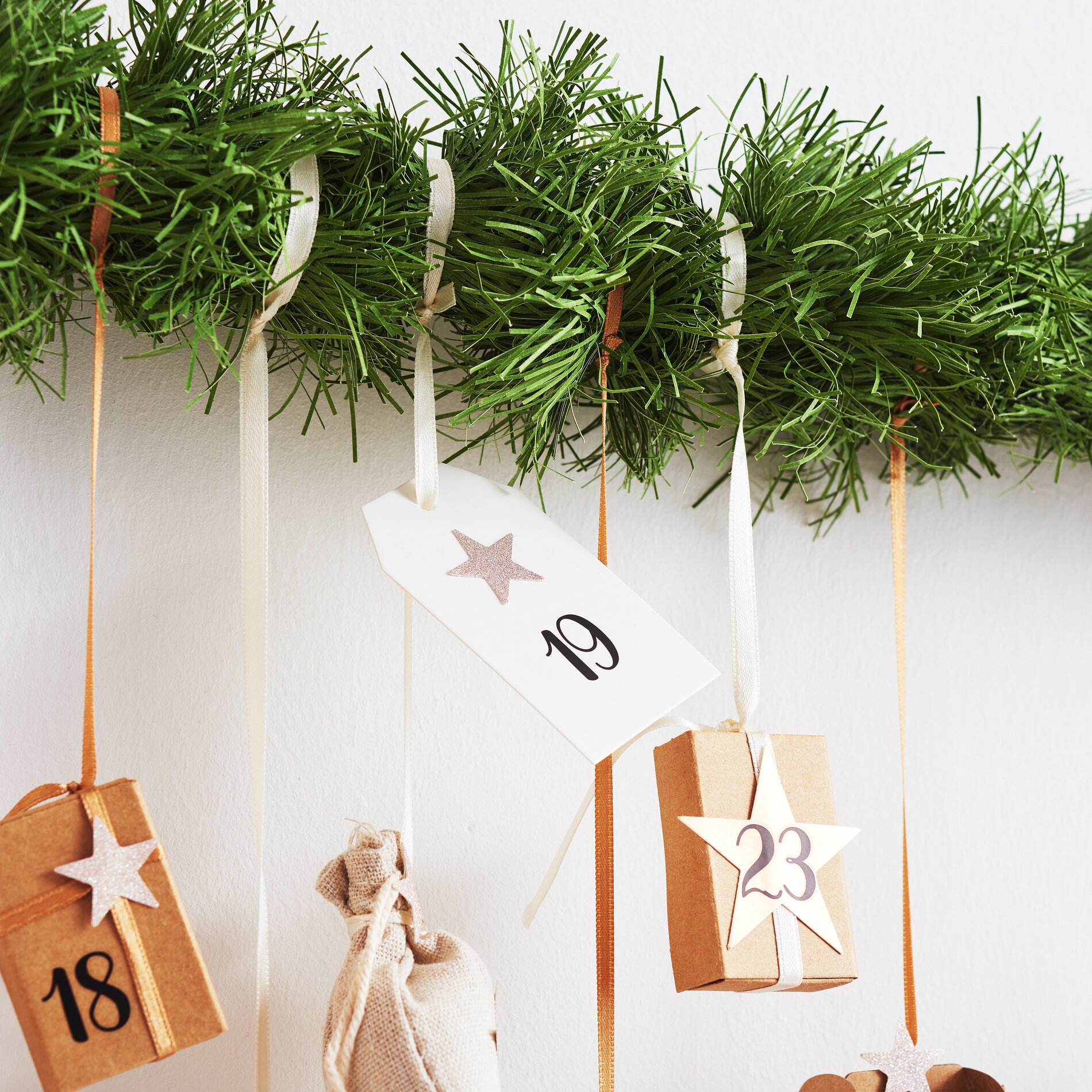Infine, appendete tutte le caselle alla ghirlanda di abete. Sistematele in modo che siano belle e facilmente accessibili. Il vostro calendario dell'Avvento fatto in casa è ora finito e pronto a rallegrare il periodo dell'Avvento.