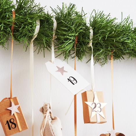 Prendete un bastone rotondo di faggio e avvolgeteci intorno la ghirlanda di abete di carta. Fissate le estremità della ghirlanda con un nastro che funge anche da appendino. In questo modo il calendario dell'Avvento avrà un tocco rustico e natalizio.