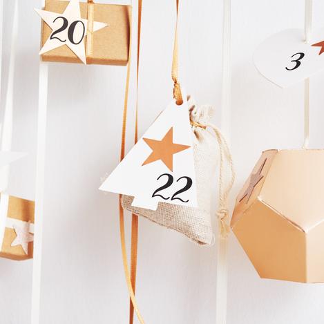 Utilizzate gli adesivi "gratta e vinci" per trasferire i numeri da 1 a 24 sulle scatole o su piccole etichette regalo. Questi adesivi sono molto facili da applicare e danno al vostro calendario dell'Avvento un tocco personalizzato.