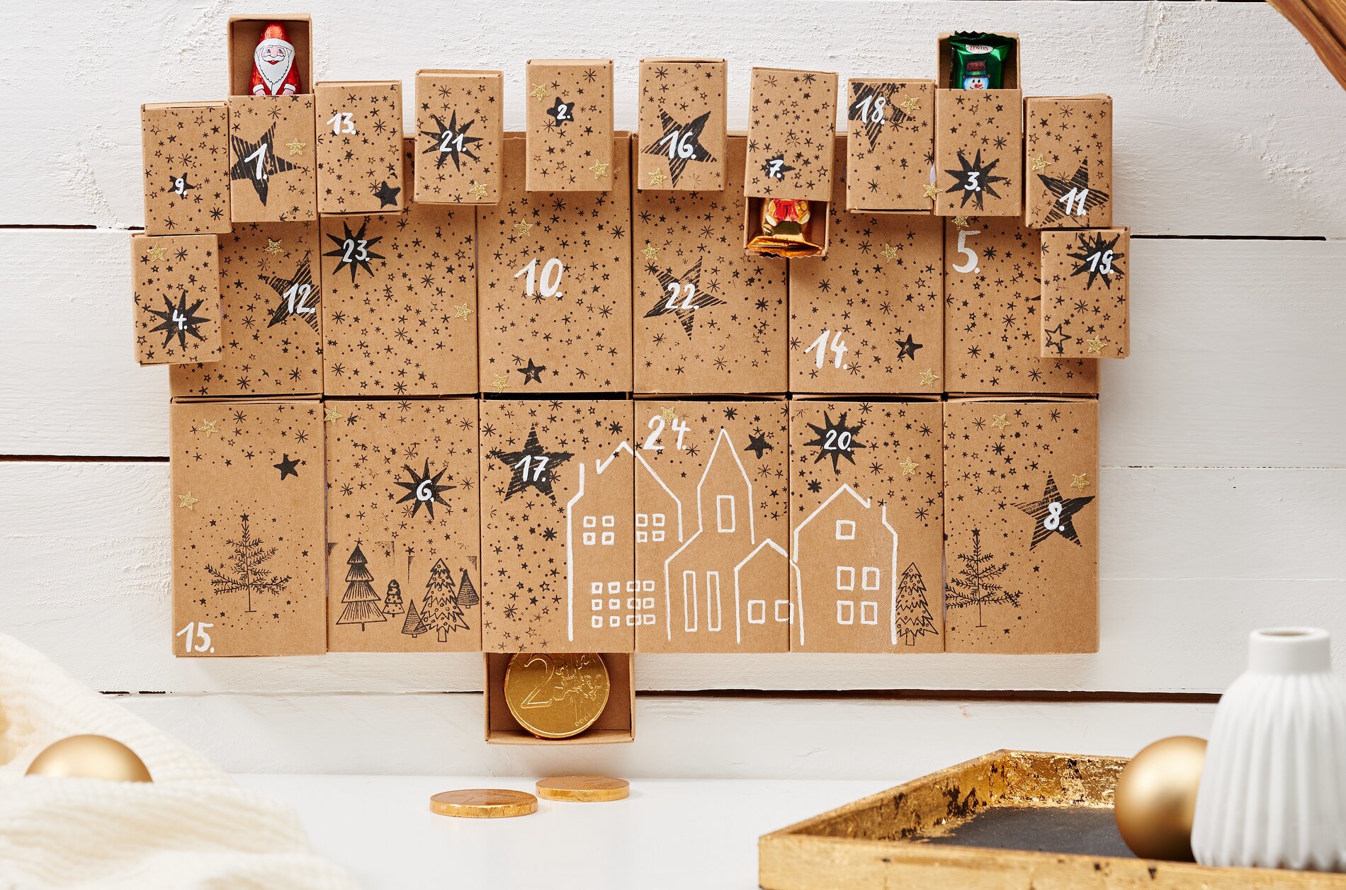 Incollare le scatole di fiammiferi piccole sul bordo superiore. In questo modo, tutte le scatole di fiammiferi possono essere aperte. Decorare anche queste scatole con i timbri.