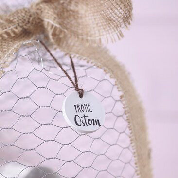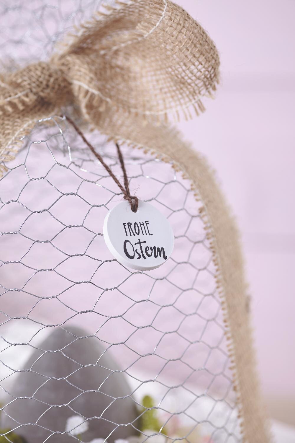 per questa idea avrete bisogno anche di un disco d'albero, di un salice decorativo, di muschio, di fiori precoci, di un piatto decorativo, di un nastro di iuta e, soprattutto, di una rete metallica.