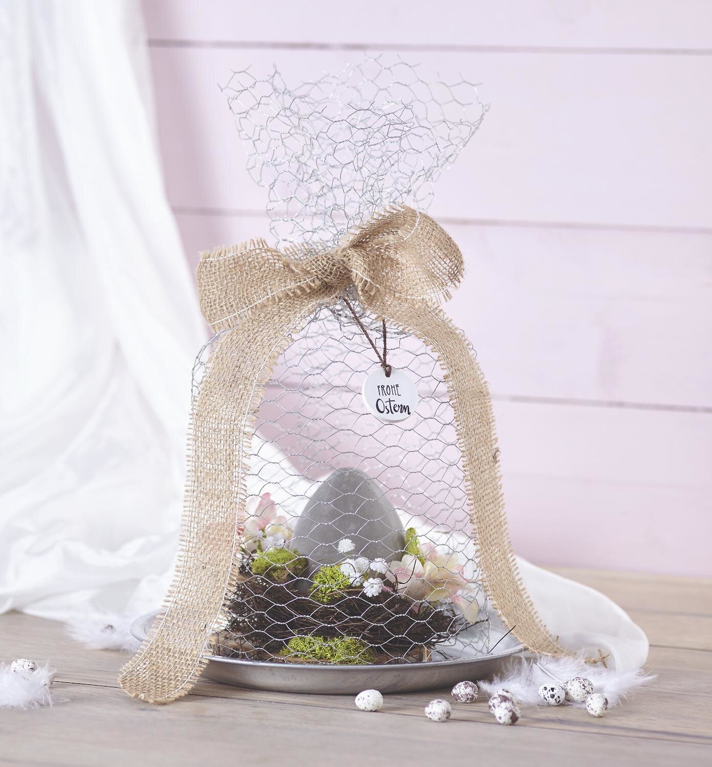 Tagliare circa 80 x 50 cm. Modellare la rete in modo da ottenere una campana. Prima di piegare il filo in un punto, posizionare la decorazione in filo sulla piastra metallica per provarla. In questo modo è possibile determinare rapidamente se la campana è della dimensione giusta e se il filo è arrotondato in modo uniforme.