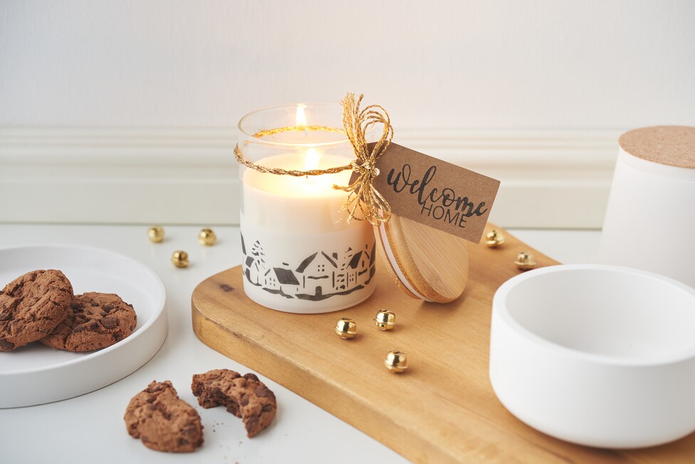 8. Applicare il motivoAvvolgere la carta da lucido con il motivo della casa decorata intorno alla parte inferiore della candela e incollarla con cura sul retro.