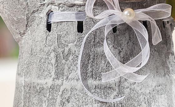 Come tocco speciale, fate passare un nastro di organza bianco attraverso le fessure della brocca di metallo, fate un fiocco e, se lo desiderate, infilate una spilla con la testa di perla al centro del fiocco.
