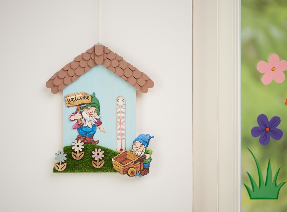 Ritagliare un pezzo dal tappetino per l'erba per ottenere l'aspetto dell'erba sull'immagine del nano e incollarlo sul termometro da parete. Incollare quindi gli gnomi da giardino in rilievo e gli spruzzi di fiori. Lasciare asciugare bene il tutto.