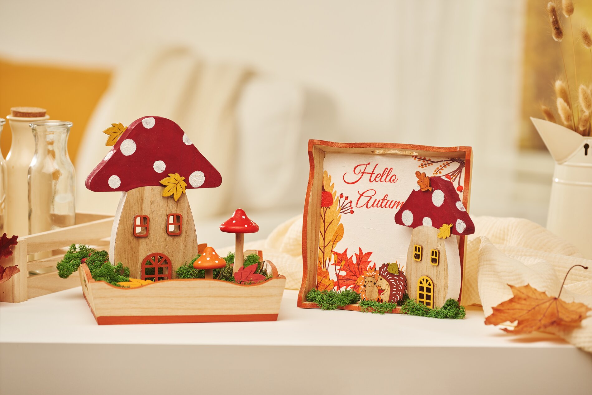 Ora mettete il vassoio più piccolo in posizione verticale e decoratelo con un piccolo rospo, il muschio islandese e i ricci sul vassoio, fissandoli con la colla a caldo.