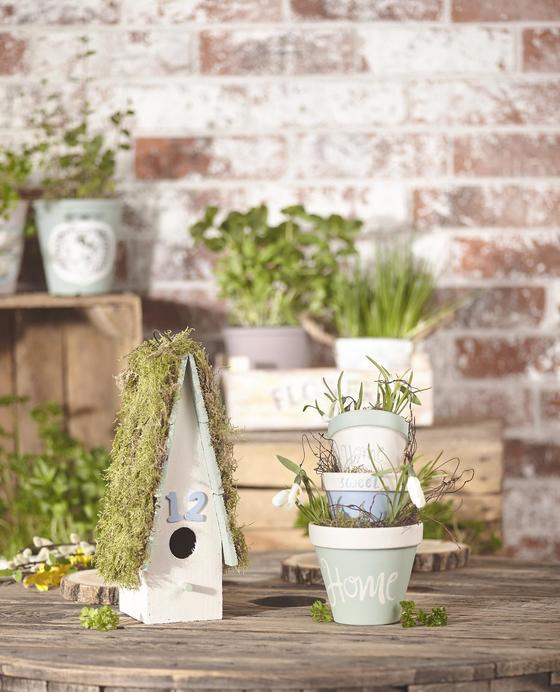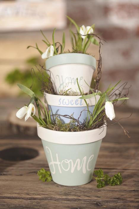 I vasi di fiori sono impilati l'uno sull'altro con un bastoncino di legno rotondo. Il bastone rotondo di Ø 10 mm viene segato a una lunghezza di circa 17 cm e inserito nei vasi. Questi possono essere riempiti con salice e muschio decorativo e infine decorati con bucaneve.