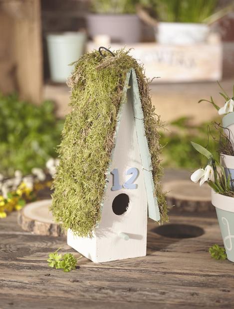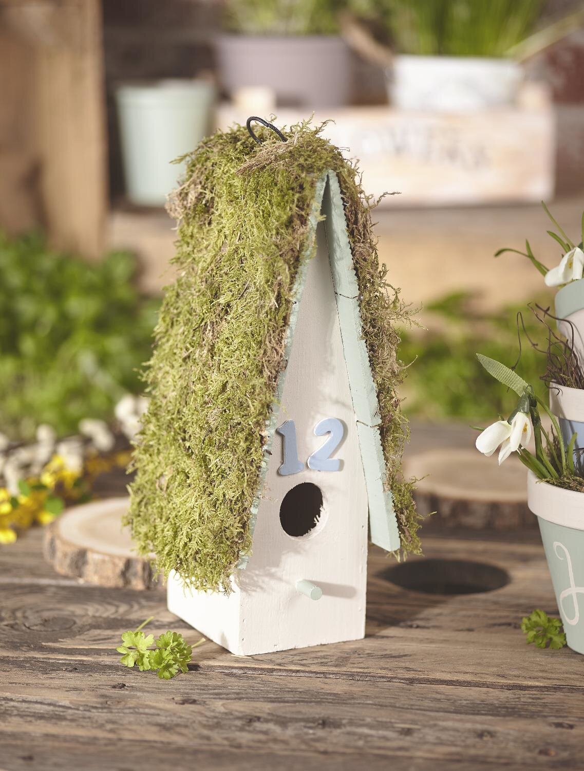 Una volta asciugata la vernice, il tetto della casetta per uccelli viene rivestito con la colla ad effetto VBS e ricoperto con il muschio in fogli