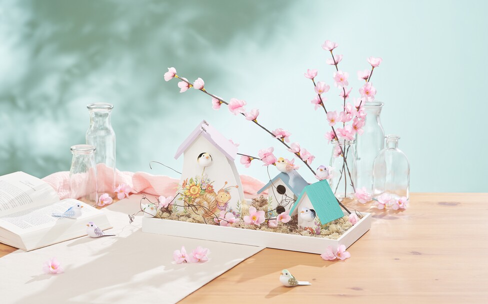 Fase 1: Primer Per prima cosa, dipinga il vassoio, le casette decorative per uccelli e un foglio di pellicola per goffratura con vernice artigianale bianca e lasci asciugare. Questo primer di colore chiaro fa sì che gli altri strati di vernice e i motivi vengano mostrati al meglio. Fase 2: Applicare la tecnica del tovagliolo al foglio in rilievoUna volta che la vernice artigianale si è asciugata, applichi uno strato sottile di vernice del tovagliolo al foglio in rilievo. La tecnica del tovagliolo le permette di trasferire motivi e disegni fini su superfici diverse. Prenda lo strato superiore stampato di un tovagliolo e lo appoggi sul foglio di goffratura trattato con la vernice. Rivesta nuovamente il motivo del tovagliolo applicato con uno strato sottile di lacca per tovaglioli. Questo fissa e sigilla lo strato di tovagliolo per mantenerlo in posizione. Lasci asciugare tutto accuratamente.Fase 3: Modellare il foglio di goffraturaTrasforma il foglio di goffratura sul tappetino speciale (o su un tappetino altrettanto morbido) VBS Speciale (o una superficie altrettanto morbida) con il lato trattato rivolto verso il basso. Ora può imprimere delicatamente i motivi e le strutture sul retro del foglio di goffratura, utilizzando le penne a rilievo. Questa tecnica di goffratura conferisce al disegno una sensazione e una profondità affascinanti.Fase 4: Ritagliare e attaccare i motiviTagliare con cura il motivo in lamina goffrata. Per attaccarlo alle casette per uccelli decorative, applichi della colla artigianale sui bordi del motivo. Lo collochi nella posizione desiderata su una casetta per uccelli e lo prema leggermente. Può attaccare altri motivi dal tovagliolo direttamente alle casette per uccelli, senza la lamina in rilievo.Fase 5: Aggiungere accenti di colorePitturi i tetti delle casette per uccelli con diversi colori artigianali a sua scelta, per dare alla decorazione ulteriore vivacità e il suo stile personale. Fase 6: Disporre la decorazione da tavolaPosizionare il vassoio in modo decorativo con il muschio islandese, che forma una base naturale. Posizioni le casette per uccelli decorate in cima. Rifinisca il ramo di fiori di ciliegio con una taglierina laterale e lo collochi ad arte sul vassoio, terminando con il fissaggio di piccoli uccelli decorativi al ramo di fiori di ciliegio con la colla a caldo. Questi simpatici dettagli conferiscono all'intera decorazione un fascino perfettoPrenda subito la creatività! È pronto a iniziare il suo progetto artigianale creativo? Visiti il nostro negozio online per ordinare tutti i materiali e gli strumenti necessari per questo fantastico progetto fai da te. Si immerga nel mondo dell'artigianato e crei la sua decorazione da giardino personalizzata. Si diverta a creare!