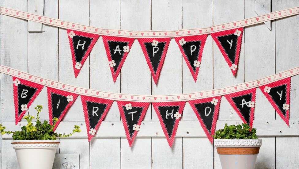Per decorare la catena di gagliardetti, si possono attaccare piccoli fiori, farfalle, bottoni ecc. con la colla a caldo. Il gesso è adatto per etichettare il bunting.