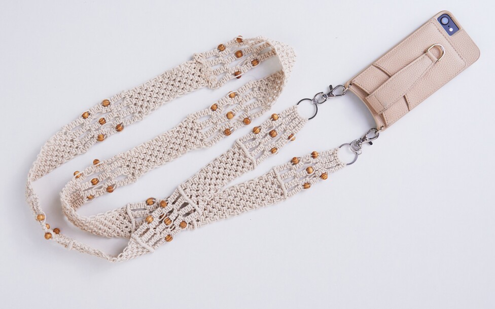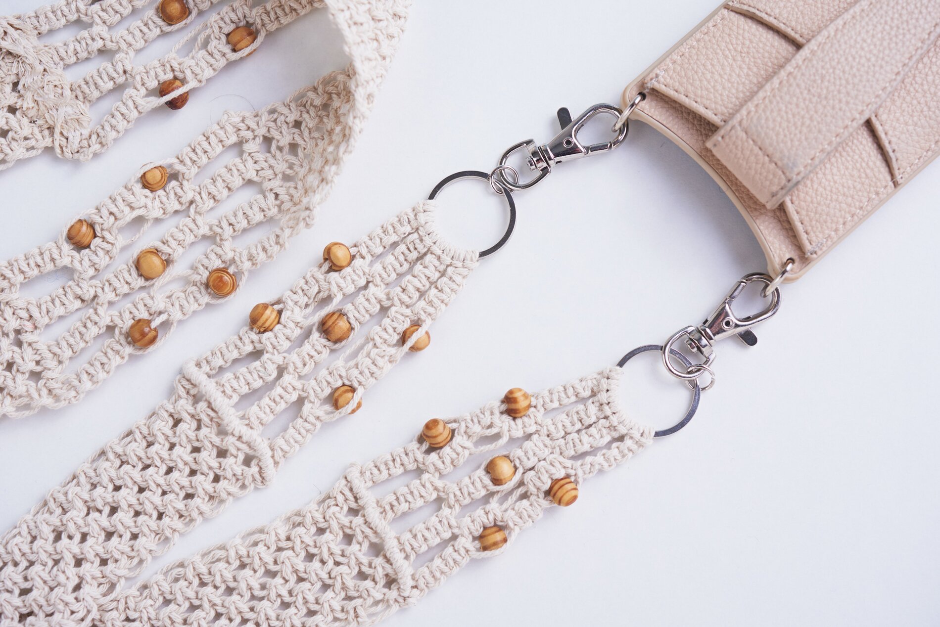 Legare la parte A utilizzando la sagoma del macramè con nodi incrociati. Una fila di nodi orizzontali a coste separa il primo schema di annodatura dalla seconda parte B. Ripetere l'annodatura fino a ottenere una catena per cellulare sufficientemente lunga. Per il secondo portachiavi, iniziate anch'esso con un nodo a testa di allodola e fate un po' di nodi.