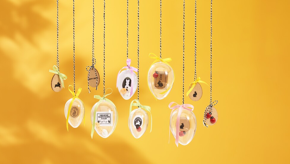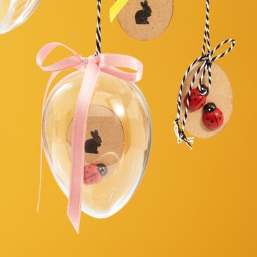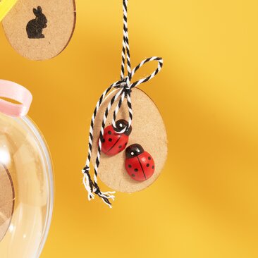 Allo stesso tempo, decorate i pendenti delle uova in MDF con piccoli messaggi e motivi stampati. Oppure incollate piccole coccinelle sui dischi ovali.