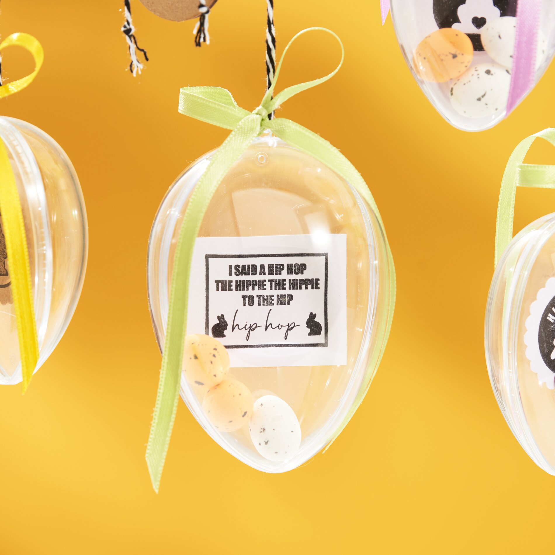 Per ricreare questa idea, avrete bisogno di uova acriliche trasparenti di diverse dimensioni e di dischi di separazione coordinati. Vi serviranno anche timbri in silicone, carta e alcuni altri accessori: Utilizzate i prodotti indicati nell'elenco dei materiali.
