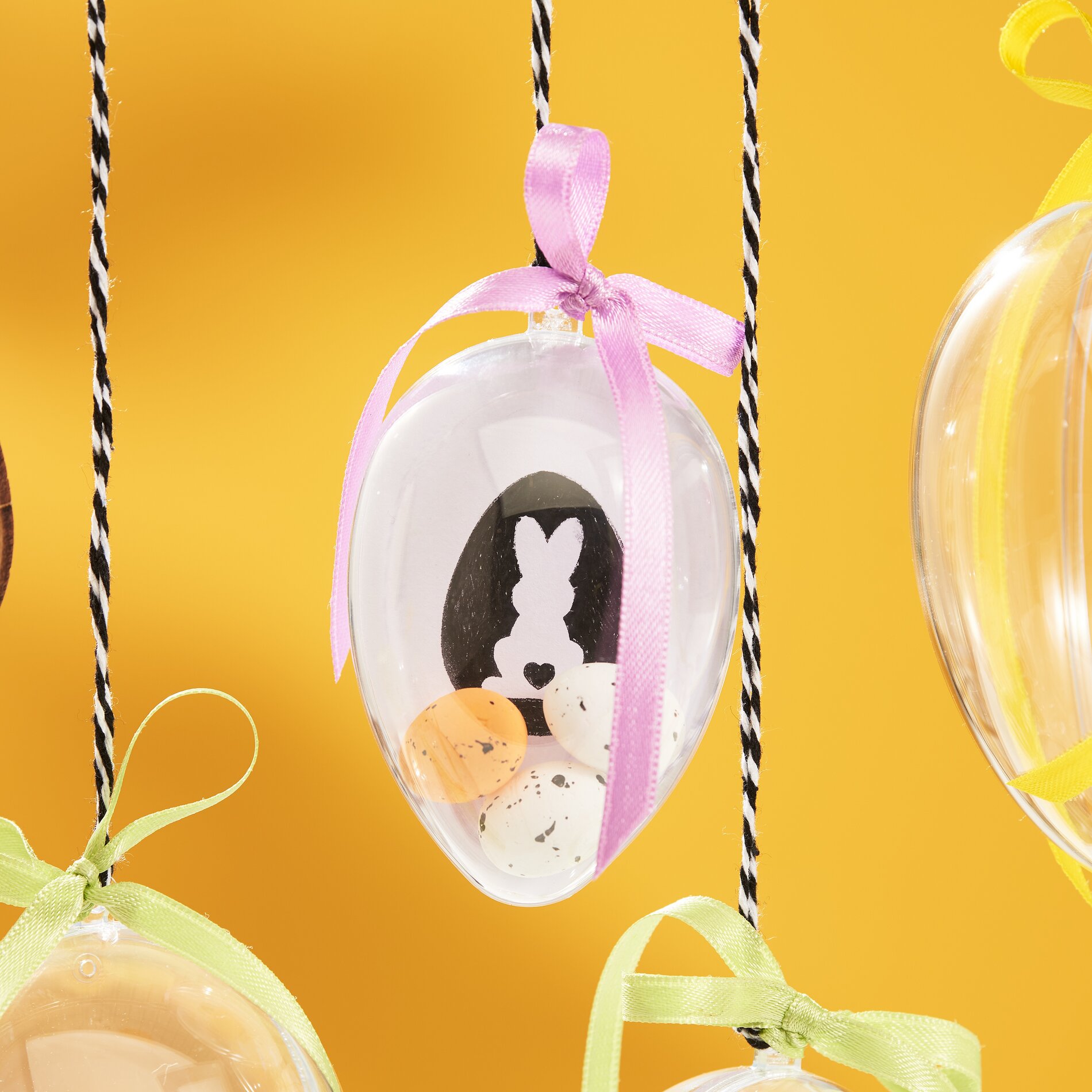 Infilate un pezzo di nastro di raso nel foro di sospensione di ogni uovo acrilico e fate un elegante fiocco. Infine, utilizzate un cordoncino di cotone bianco e nero come nastro per appendere tutte le uova di Pasqua realizzate.