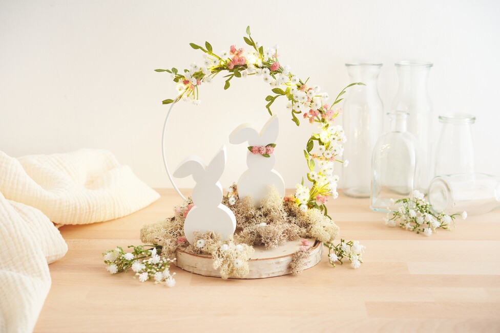 Incolli una piccola corona di fiori su uno dei coniglietti e attacchi saldamente entrambe le fusioni di coniglietti al disco di betulla con la colla a caldo. Infine, può incollare il muschio d'Islanda e qualche altro fiore sul disco di betulla per enfatizzare l'aspetto naturale della composizione.