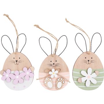 Ogni coniglietto di questo set ha un design unico: Un coniglietto ha il corpo rosa chiaro con strisce bianche, un altro è un viola tenue con puntini bianchi, e il terzo coniglietto brilla in un fresco verde chiaro con fiori bianchi. Un cordoncino di iuta intorno al collo completa perfettamente il design.
