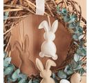I pendenti decorativi sono larghi 5,5 cm e alti 11,5 cm e sono realizzati in ecopelle e poliestere. La superficie morbida e i dettagli deliziosi li rendono un vero e proprio richiamo visivo. Questi simpatici conigli sono ideali per portare freschezza e gioia alle sue decorazioni pasquali.
