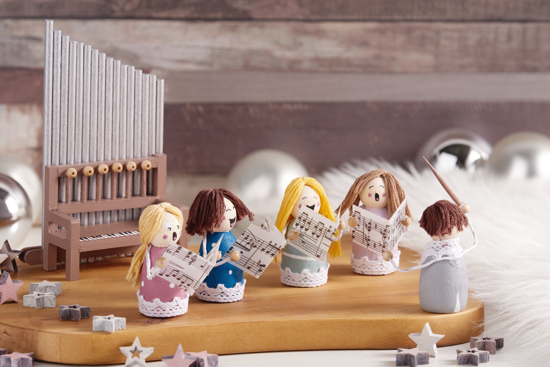 Dipingere i coni delle figure in piccoli corpi e decorarli con un nastro bianco all'uncinetto. Il maestro del coro è particolarmente bello con un colletto all'uncinetto. Tagliare circa 20 cm di filo di carta per le braccia di ogni figura, raddoppiarlo e attorcigliarlo. Attaccare ogni pezzo al "collo" della figura, modellarlo, accorciare le braccia se necessario e incollare perline di legno alle estremità.