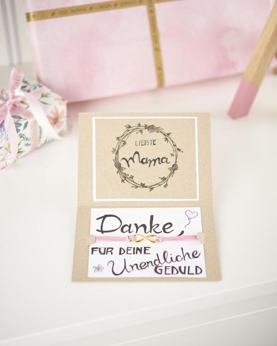 a mano ; nel nostro esempio abbiamo scelto "Grazie per la tua infinita pazienza". Incollare quindi il rettangolo tagliato nel cartoncino di carta kraft. Fate passare le estremità del braccialetto attraverso le incisioni del cartoncino e fissatelo con del nastro adesivo sul retro.
