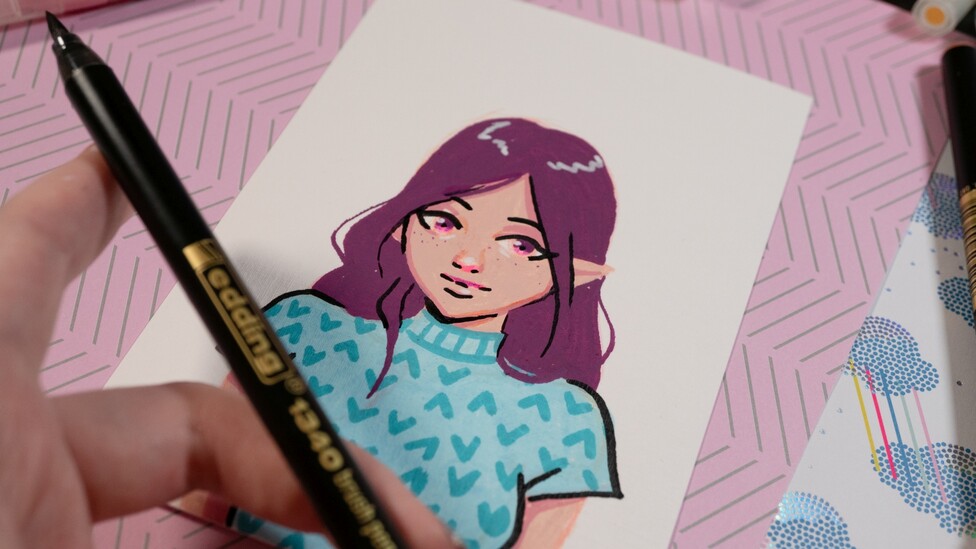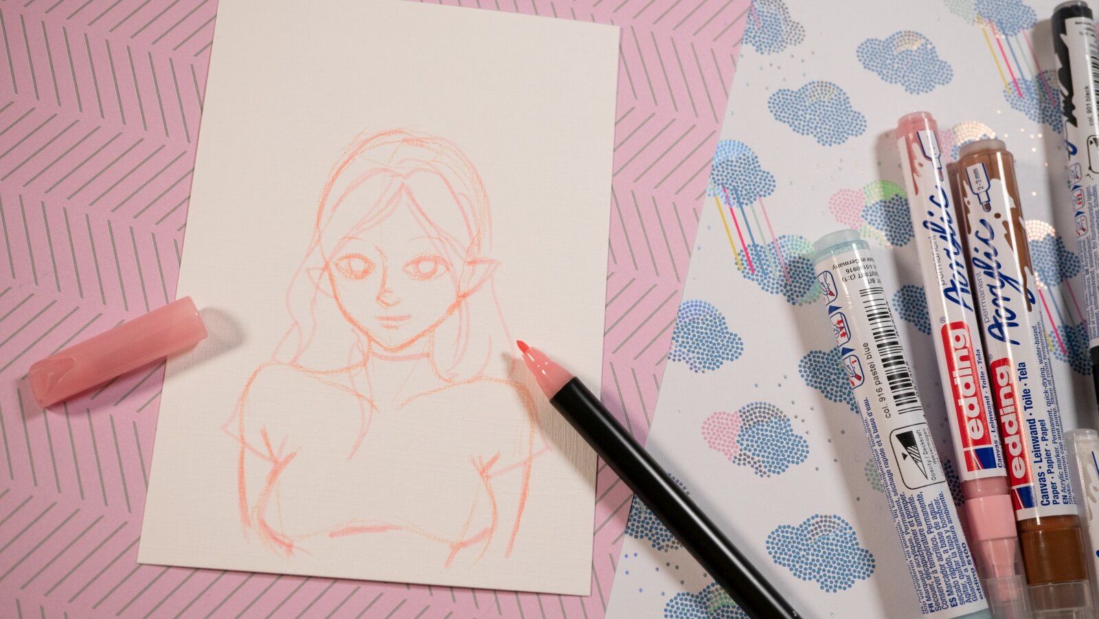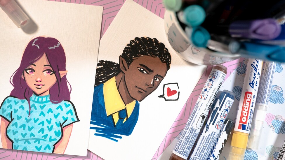 Avete voglia di disegnare personaggi manga o anime? Non è così difficile, vi mostreremo passo dopo passo come fare. Gli occhi grandi, che caratterizzano tutti i manga e riflettono le emozioni del rispettivo personaggio, sono particolarmente importanti. Con i pennarelli acrilici edding e le penne a punta di fibra, avete a disposizione esattamente gli "strumenti" giusti per creare immagini fantastiche. Abbiamo anche la carta giusta: il tampone per colori acrilici e a olio di edding. Si adatta perfettamente alle proprietà specifiche dei pennarelli acrilici e ha un'ottima capacità di assorbimento.