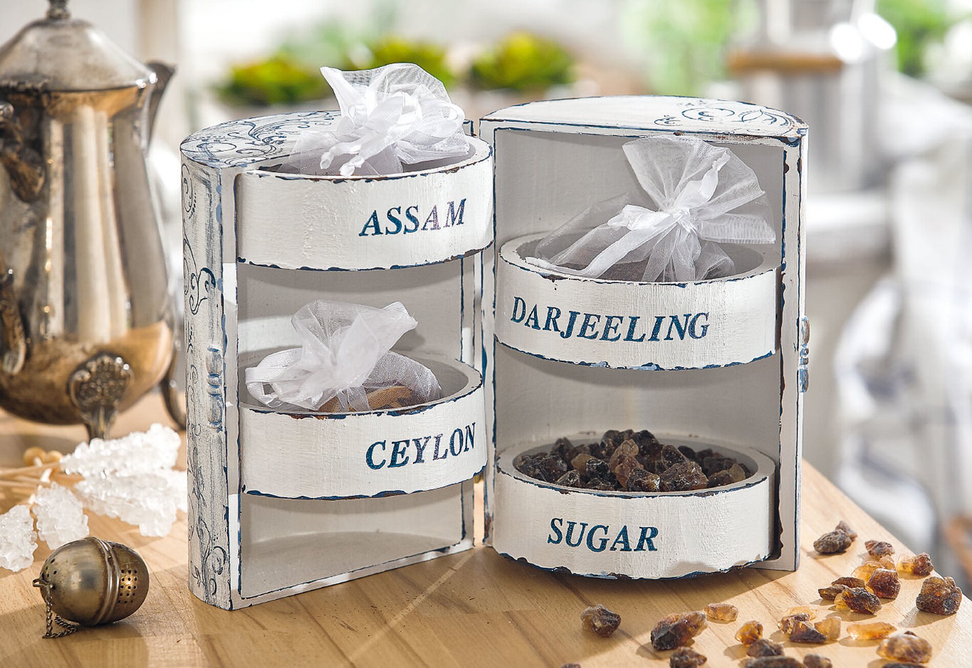 Impregnare il mobile di bianco e lasciarlo asciugare. Con una spugna da pittura, passate la vernice acrilica marrone sulla superficie esterna e mettete in risalto le maniglie. Una volta asciutto, applicare i timbri sugli ornamenti. Suggerimento: i timbri flessibili in silicone possono essere utilizzati anche sulle superfici rotonde senza blocco acrilico. Timbrare il testo desiderato sul fronte dei singoli scomparti. Tracciare tutti i bordi con la vernice artigianale blu, quindi ripassare con la vernice acrilica marrone. Mescolare un colore blu chiaro con vernice artigianale blu navy e bianca e usarlo per aggiungere singoli punti ai bordi per ottenere un aspetto smaltato.