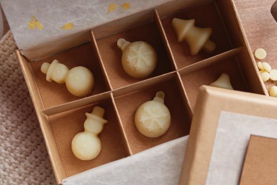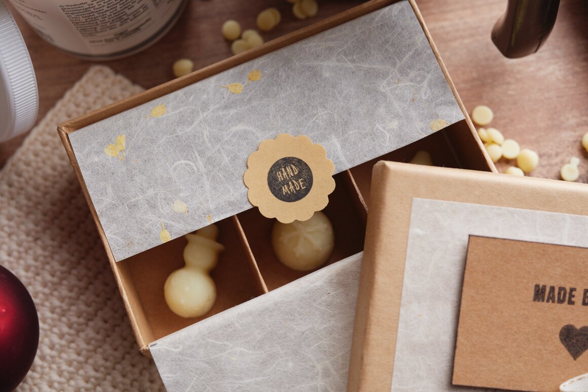 Non appena i cioccolatini alla crema per le mani sono nella scatola, posizionate la carta naturale in eccesso sopra la griglia e sigillatela con un adesivo.