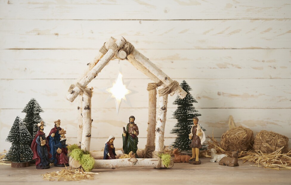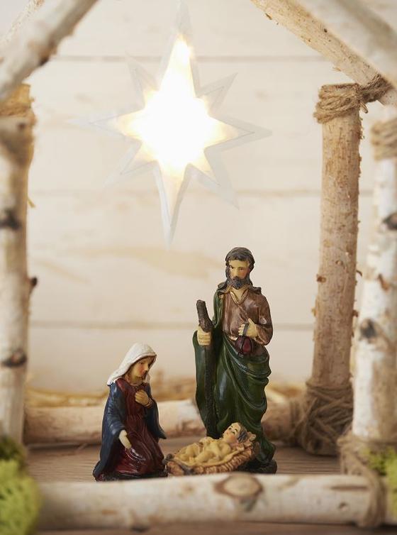 Infine, potete disporre le figure del presepe come preferite e decorarle con abeti in miniatura, paglia e muschio.